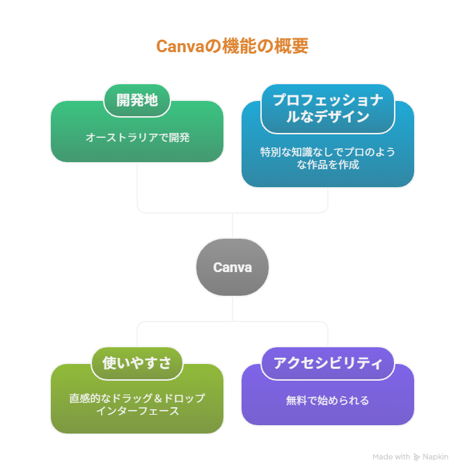 Canvaは、オーストラリアで開発されたオンラインのデザインツールです。ドラッグ&ドロップで操作できるため、特別な知識がなくてもプロのような作品を作ることができます。無料で始められるのも大きな魅力です。
